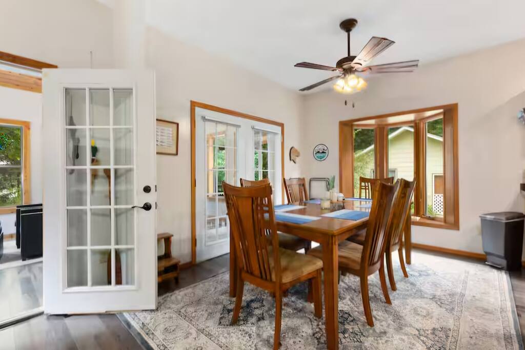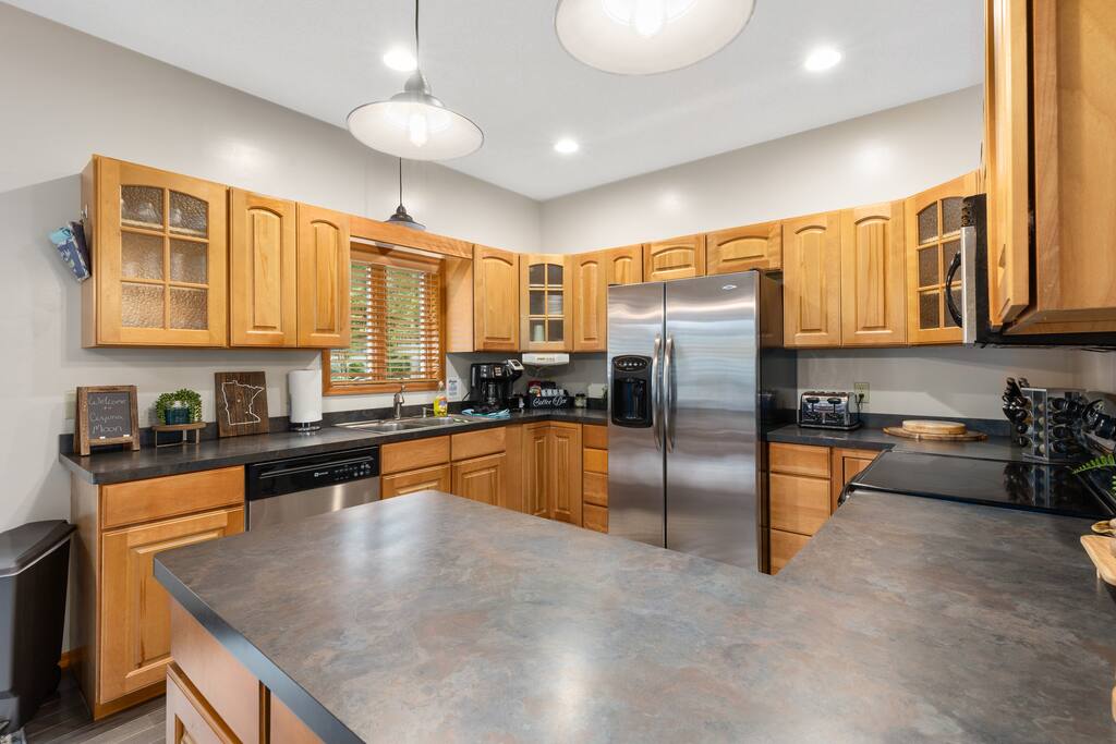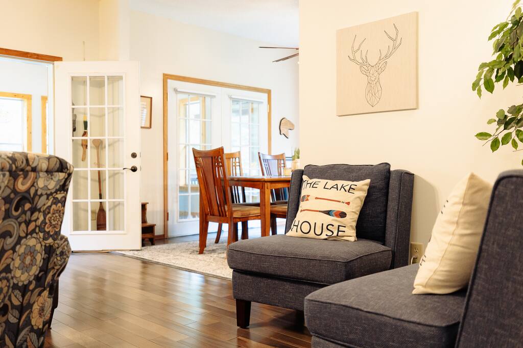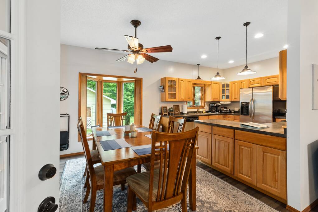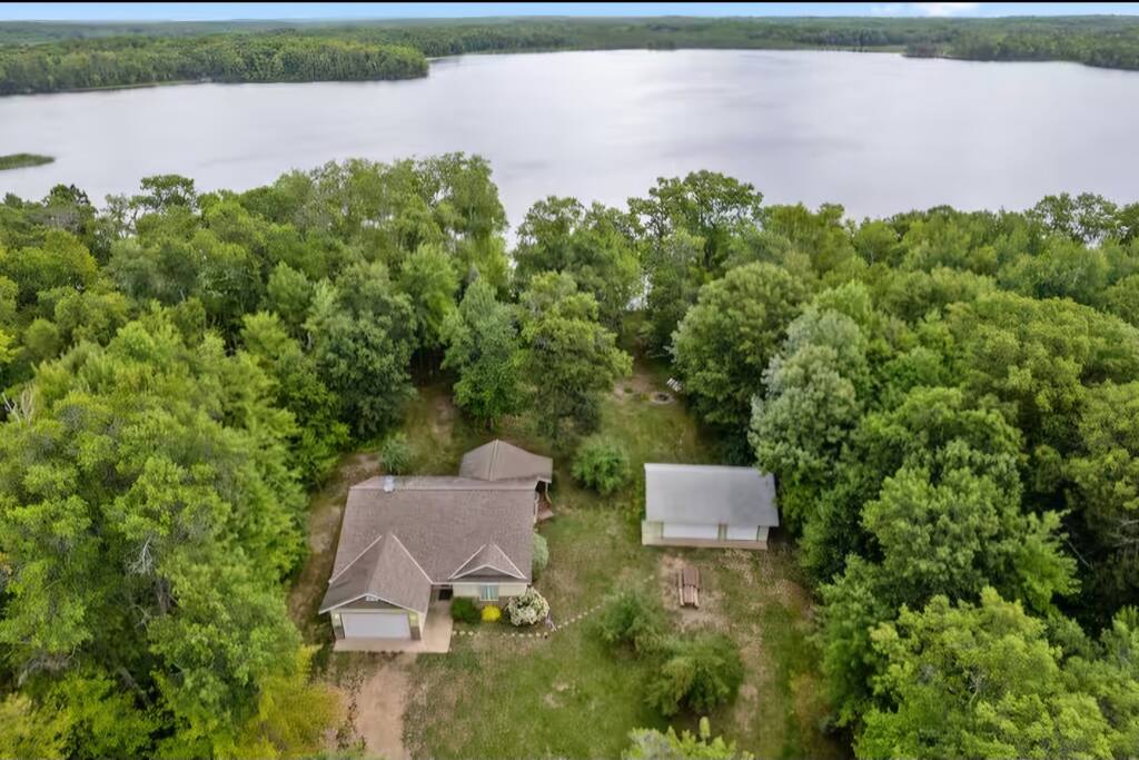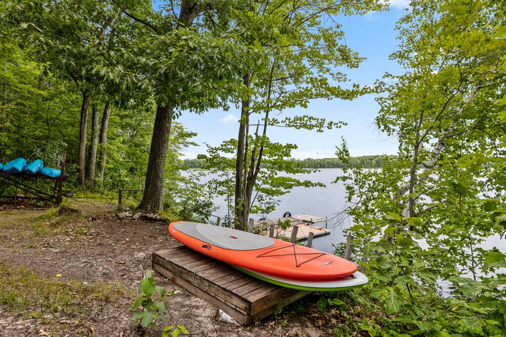 With 200' of shoreline on 242-acre Fool Lake, enjoy a modern 3BR 2BA home and endless activities nearby, including golf, bike trails (paved and mountain bike), kayaking, snowmobiling, shopping, dining, and fishing. * Optional pontoon (fish/cruising combo) rental available! * Separate game room included for guests ! * Great for your craft weekend! Cuyuna Moon offers one-level living with three spacious bedrooms and two updated bathrooms. Bedroom one boasts a king bed suite with a larger smart TV and an en suite bathroom, while bedroom two has two full-size beds, and bedroom three features twin over full bunk bed. The living room provided additional sleeping options, with pull-out queen and pull-out twin beds. Inside, guests will find a fully stocked kitchen, seating for 8 around the dining table, a modern interior with a large smart TV, and a connected 3-season porch with additional seating and a game table. Outside, guests can indulge in peace and tranquility in a very quiet setting. Enjoy free use of yard games such as cornhole, ladder ball, bocce, horseshoes, and more. For cozy nights around the bonfire, the fire pit comes with a large supply of firewood and toasting sticks. On the lake, guests will discover a serene setting that showcases nature and the best of the north woods. The property provides a dock, a floating swim dock, four kayaks and two paddleboards. Other amenities include free high-speed Wi-Fi, smart TV's, a complimentary washer/dryer, a garage, life jackets, snowshoes, bike stand and tools, Pack 'N Play, high chair, games, puzzles, books, and more! You will have full access to the entire house, the connected garage, the laundry room, and the lake. Please practice good water safety while enjoying Fool Lake and our property, including the use of life jackets for water sports and activities. We provide life jackets, kayaks, SUPs, swim raft, and a dock for your convenience. In the winter, guests can enjoy snowmobiling, snowshoeing, fat tire biking and ice fishing! A bar/restaurant is a short, 5-minute drive away and Crosby is 10 minutes away where you can enjoy great dining, shopping , biking, golf, pickleball, and so much more! Within a 15-20 minute drive, guests can explore Crosslake restaurants, shopping, lakes, golf, and much more! Come and experience a rejuvenating retreat at Cuyuna Moon, where you can embrace the tranquil surroundings and make lasting memories with friends and family!