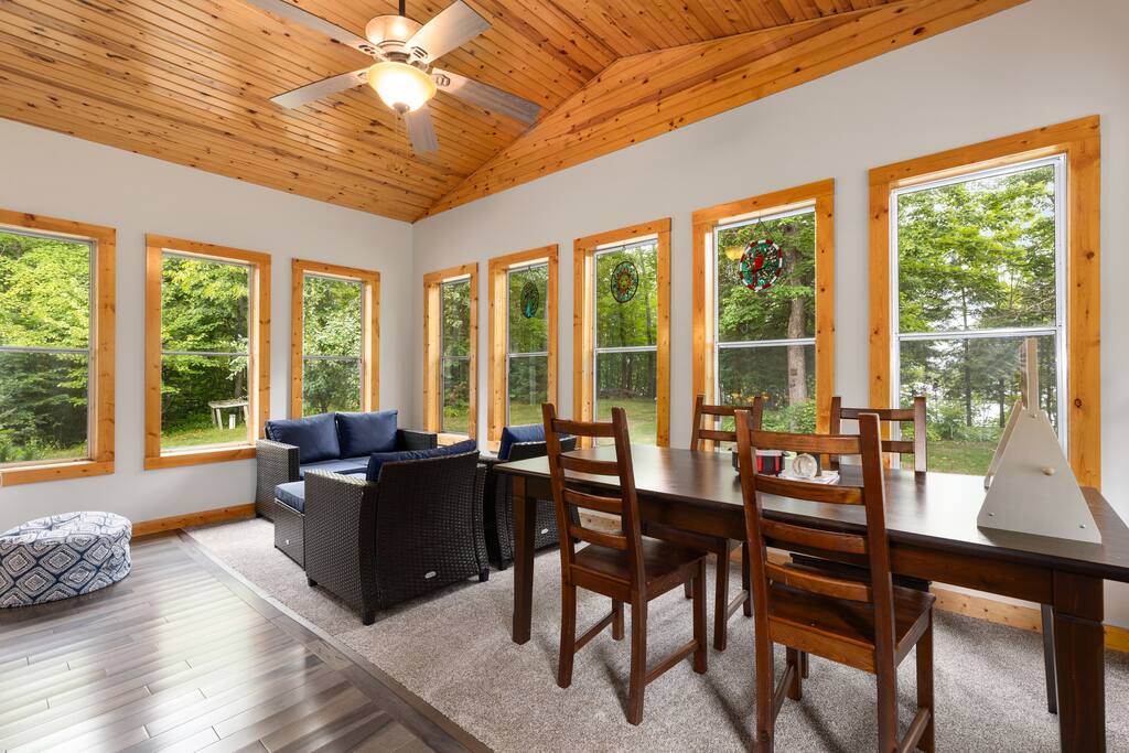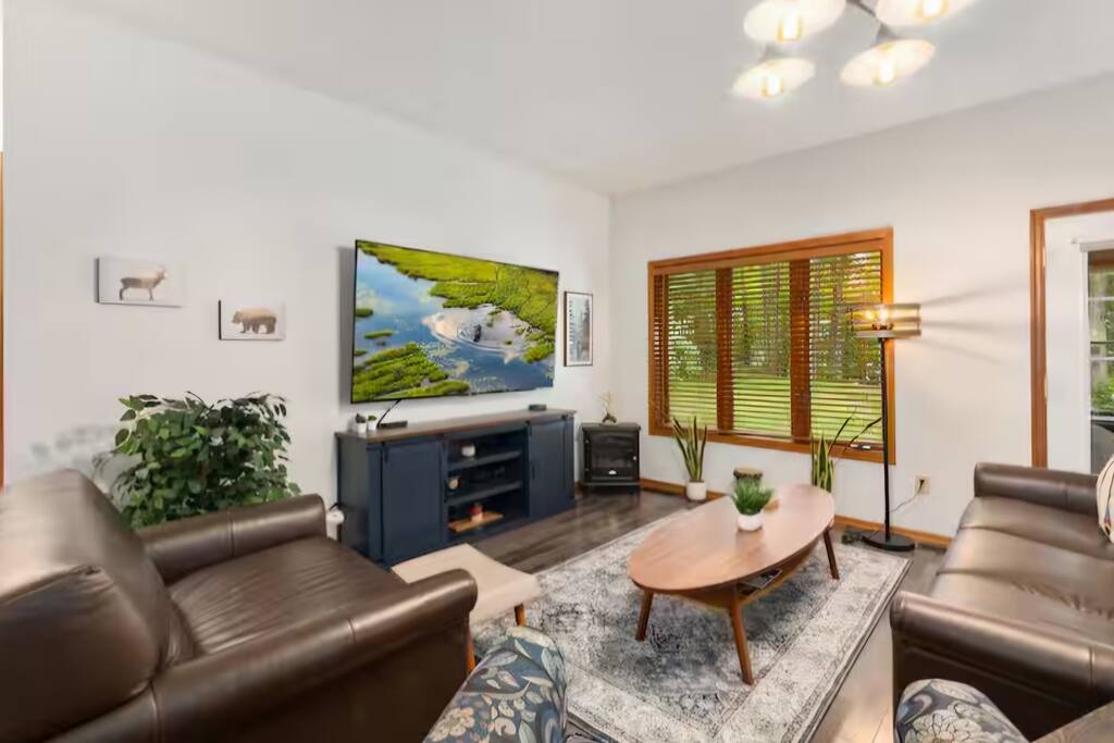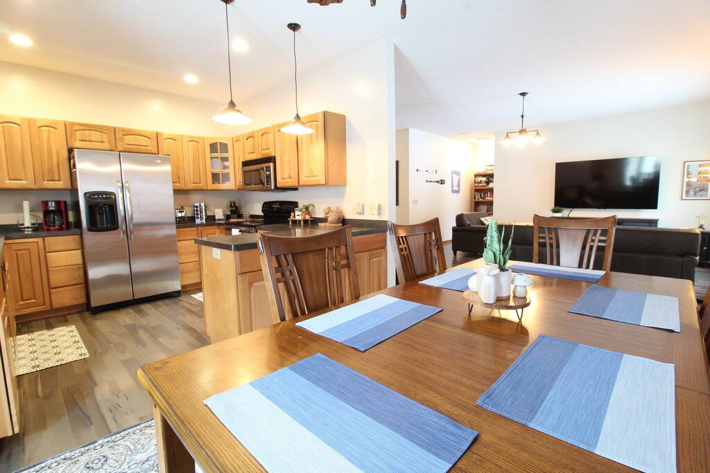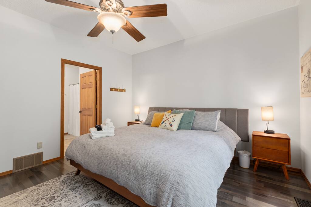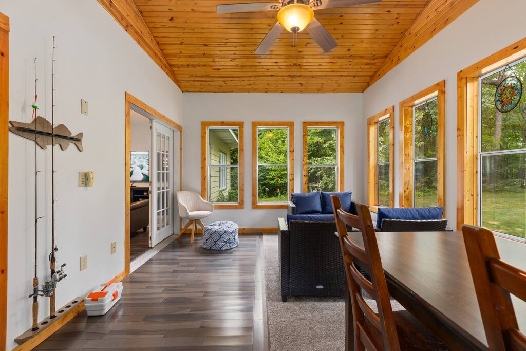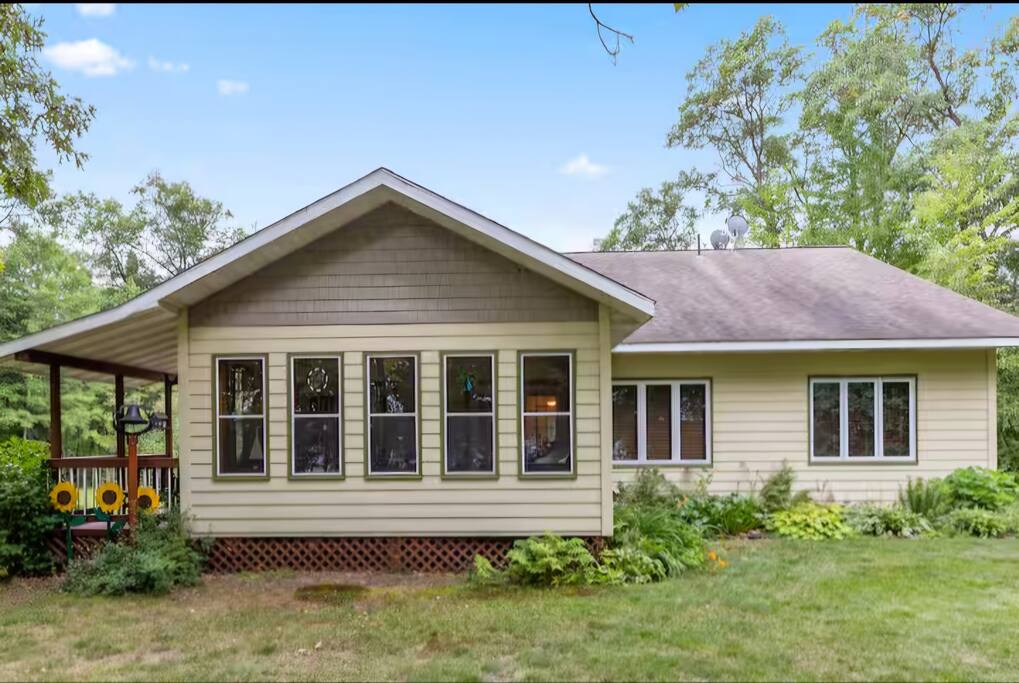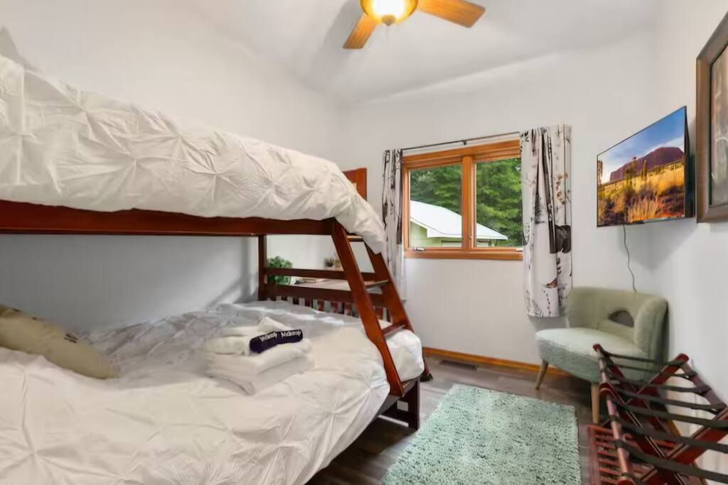 With 200' of shoreline on 242-acre Fool Lake, enjoy a modern 3BR 2BA home and endless activities nearby, including golf, bike trails (paved and mountain bike), kayaking, snowmobiling, shopping, dining, and fishing. * Optional pontoon (fish/cruising combo) rental available! * Separate game room included for guests ! * Great for your craft weekend! Cuyuna Moon offers one-level living with three spacious bedrooms and two updated bathrooms. Bedroom one boasts a king bed suite with a larger smart TV and an en suite bathroom, while bedroom two has two full-size beds, and bedroom three features twin over full bunk bed. The living room provided additional sleeping options, with pull-out queen and pull-out twin beds. Inside, guests will find a fully stocked kitchen, seating for 8 around the dining table, a modern interior with a large smart TV, and a connected 3-season porch with additional seating and a game table. Outside, guests can indulge in peace and tranquility in a very quiet setting. Enjoy free use of yard games such as cornhole, ladder ball, bocce, horseshoes, and more. For cozy nights around the bonfire, the fire pit comes with a large supply of firewood and toasting sticks. On the lake, guests will discover a serene setting that showcases nature and the best of the north woods. The property provides a dock, a floating swim dock, four kayaks and two paddleboards. Other amenities include free high-speed Wi-Fi, smart TV's, a complimentary washer/dryer, a garage, life jackets, snowshoes, bike stand and tools, Pack 'N Play, high chair, games, puzzles, books, and more! You will have full access to the entire house, the connected garage, the laundry room, and the lake. Please practice good water safety while enjoying Fool Lake and our property, including the use of life jackets for water sports and activities. We provide life jackets, kayaks, SUPs, swim raft, and a dock for your convenience. In the winter, guests can enjoy snowmobiling, snowshoeing, fat tire biking and ice fishing! A bar/restaurant is a short, 5-minute drive away and Crosby is 10 minutes away where you can enjoy great dining, shopping , biking, golf, pickleball, and so much more! Within a 15-20 minute drive, guests can explore Crosslake restaurants, shopping, lakes, golf, and much more! Come and experience a rejuvenating retreat at Cuyuna Moon, where you can embrace the tranquil surroundings and make lasting memories with friends and family!